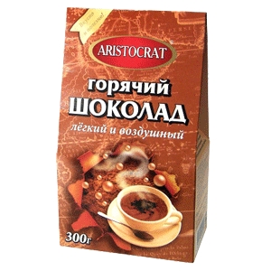 Описание:?растворимый горячий шоколад. Благодаря высокому содержанию какао, продукт отличается насыщенным вкусом и ароматом. Горячий шоколад?- изысканный энергетический напиток, приготовленный из? какао бобов 100%. Упакован в пластиковый пакет с фирменным дизайном.